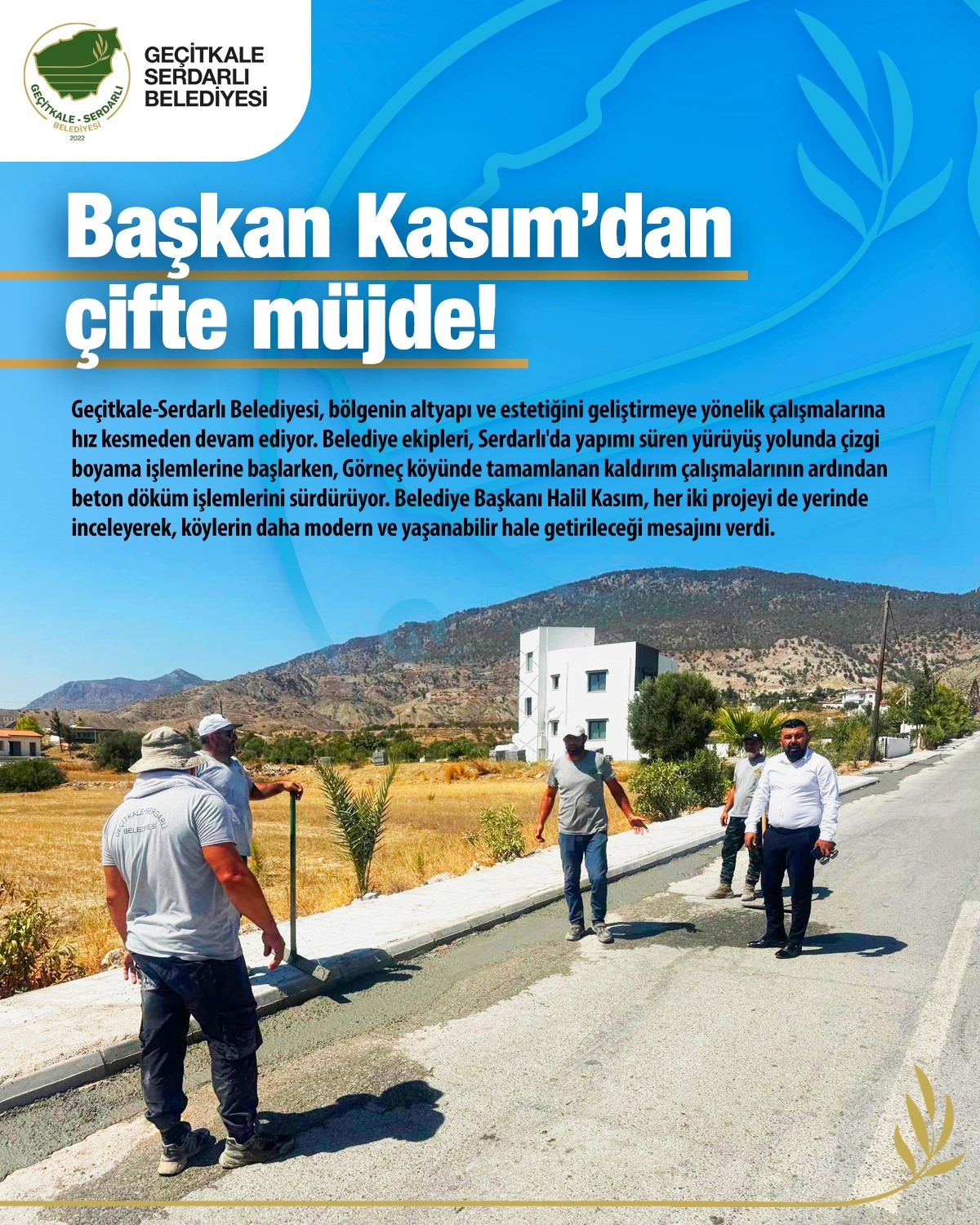 Geçitkale-Serdarlı Belediyesi, bölgenin altyapı ve estetiğini geliştirmeye yönelik çalışmalarına hız kesmeden devam ediyor. Belediye ekipleri, Serdarlı'da yapımı süren yürüyüş yolunda çizgi boyama işlemlerine başlarken, Görneç köyünde tamamlanan kaldırım çalışmalarının ardından beton döküm işlemlerini sürdürüyor. Belediye Başkanı Halil Kasım, her iki projeyi de yerinde inceleyerek, köylerin daha modern ve yaşanabilir hale getirileceği mesajını verdi.