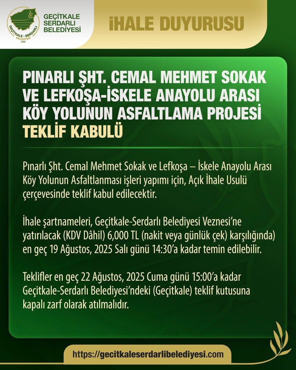 Pınarlı Şehit Cemal Mehmet Sokak ve Lefkoşa-İskele Anayolu Arası Köy Yolunun Asfaltlanması Tweet Bu kategoriden diğerleri: « Görneç Ağıllar Bölgesi Asfaltlama Projesi